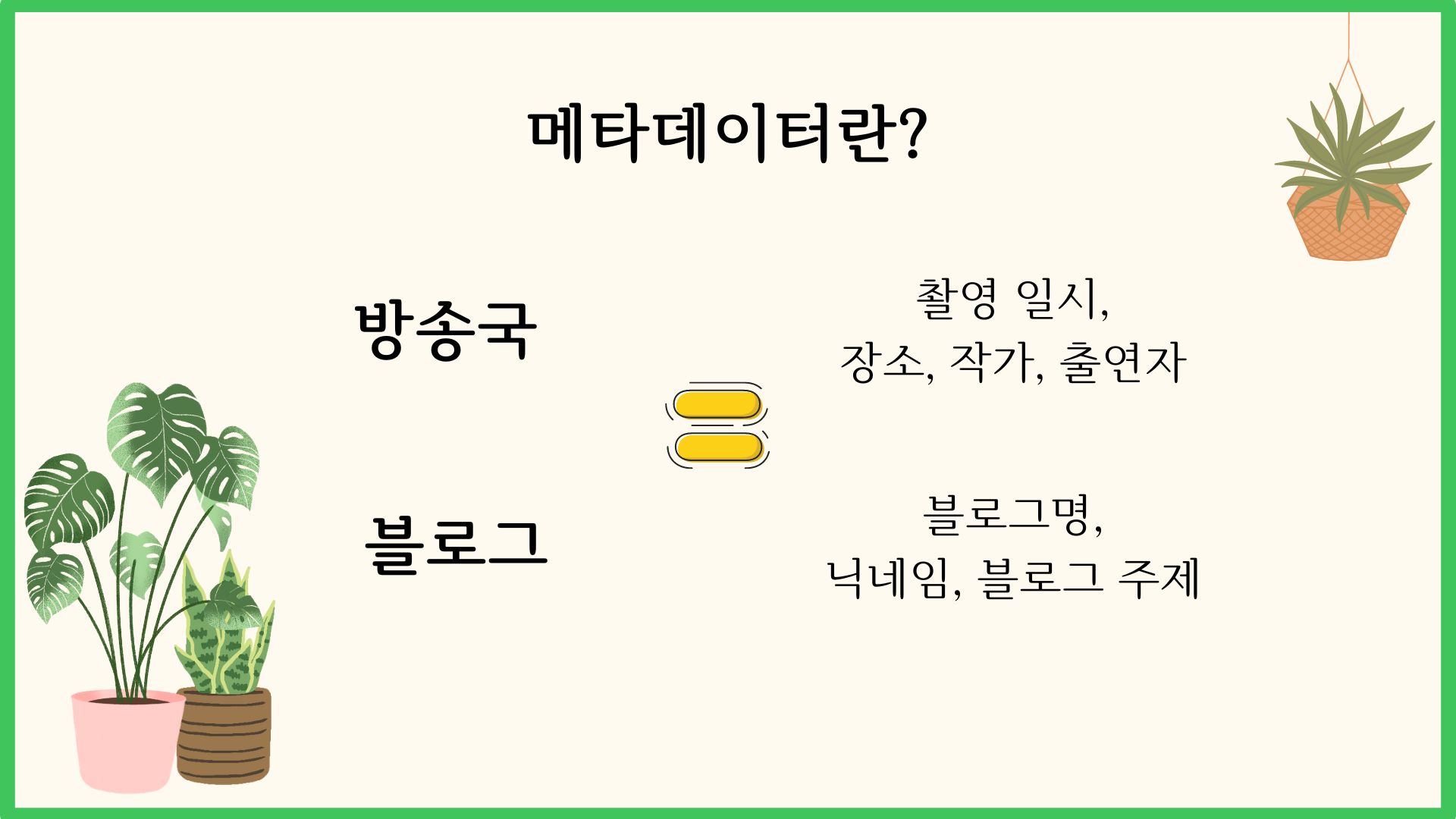 네이버 블로그에서 메타데이터는 일련의 데이터를 "정의하고 설명해 주는 데이터"를 의미합니다. 설명이 조금 어렵지만 아래의 예를 들어 설명해 보겠습니다.