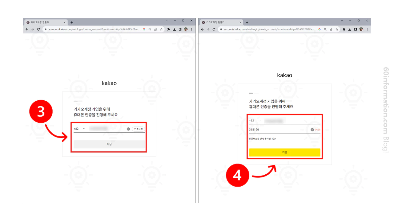 4. 전화번호 확인 절차, "인증 코드" 입력.