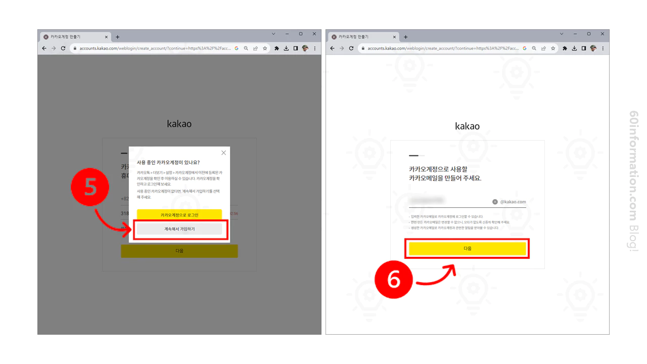 5. 사용 중인 카카오계정이 있나요? "계속해서 가입하기" 선택.