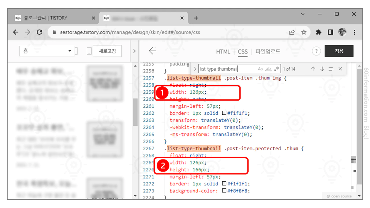 🔽 썸네일의 크기가 작은 느낌이 든다면 크기를 조절하면 된다. 스킨 편집 ➜ CSS를 선택 ➜ CSS에서 Ctrl + F키를 눌러 "list-type-thumbnail" 검색 ➜ width의 크기를 변경. (아래 블록을 참고)