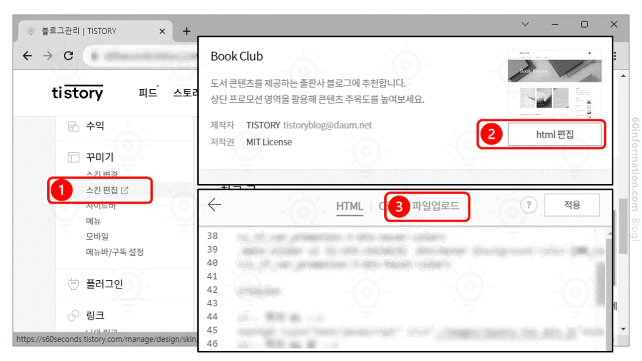 🔽 북클럽 스킨의 "스킨 편집" ➜ "html 편집"으로 이동 후 아래의 코드를 복사, </head> 윗부분에 넣어 주면 된다.