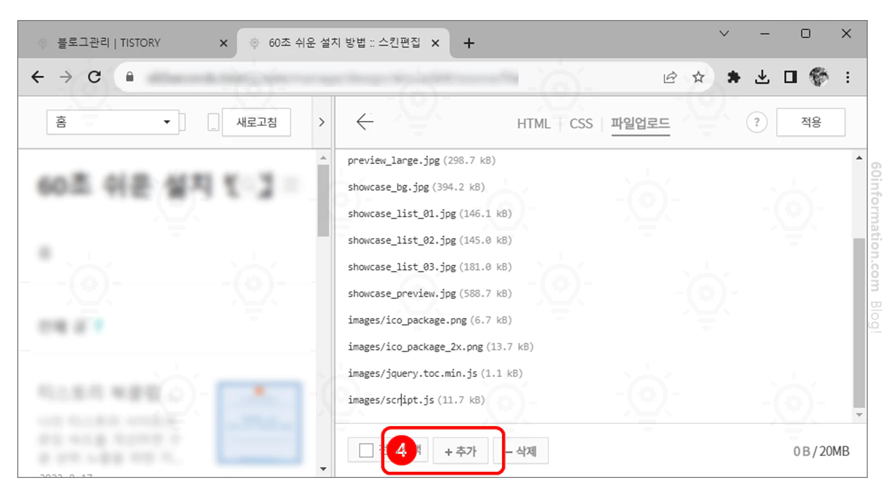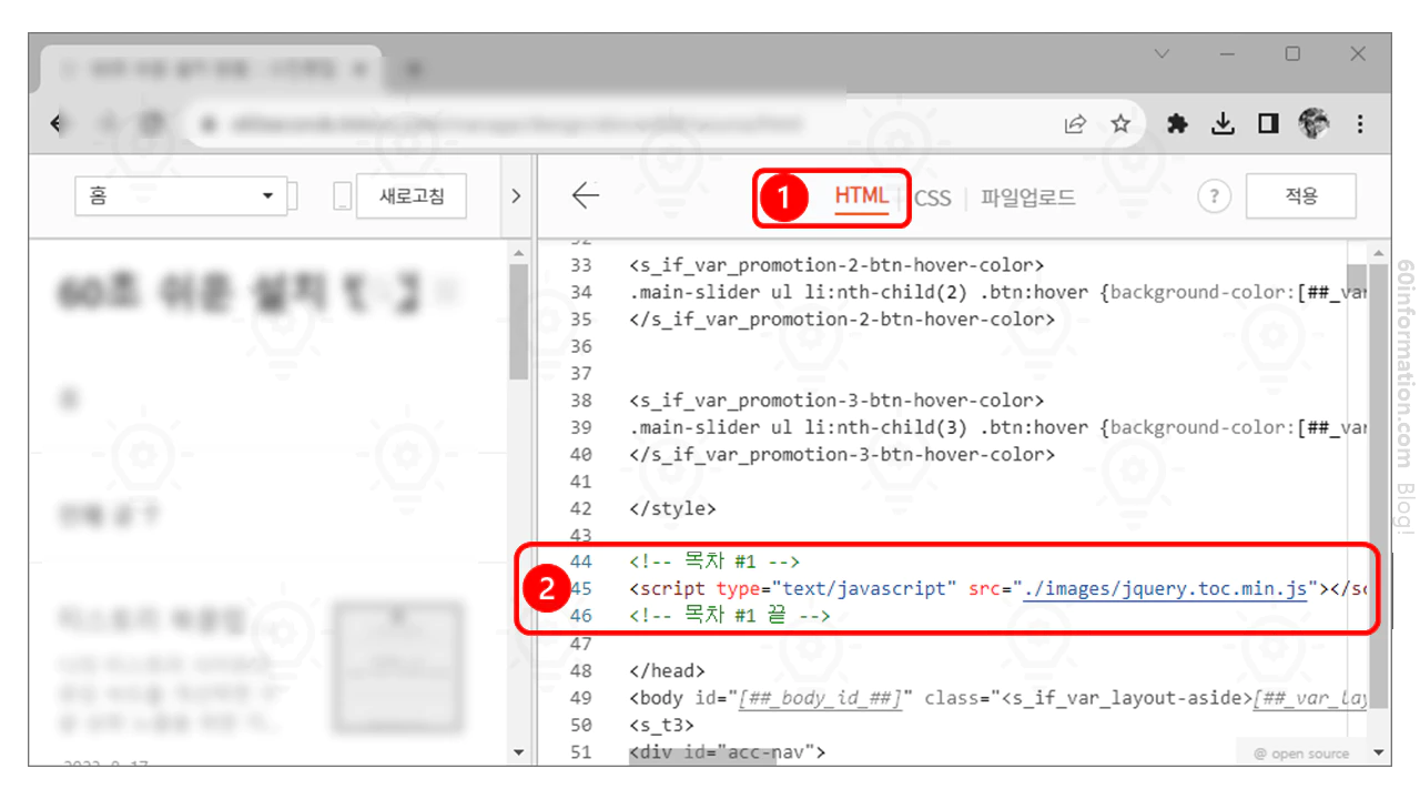 🔽 다운로드한 "jauery.toc.min.js"파일을 티스토리 스킨에 업로드하는 작업