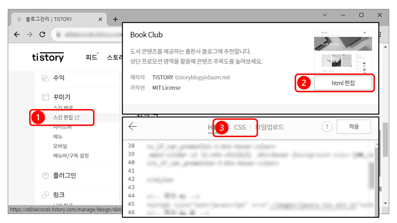 🔽 북클럽 스킨의 "스킨 편집" ➜ "html 편집"으로 이동 후 아래의 코드를 복사, </head> 윗부분에 넣어 주면 된다.